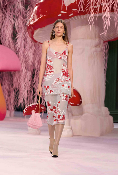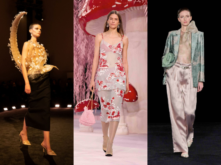 パールとチェーンをトリミングしたオーガンディのジャケットやスカート、そこに繊細なキノコの刺繍が重ねられる。薄い透け感のきれいな色のセットアップに続いて、花弁を重ねたような刺繍のスーツが現れる。ペーパータッチのツイードスーツは、メゾンのシグネチャーを軽やかに仕上げた今シーズンらしい解釈。ニットスーツはフィルクーペのように編み地が途中で飛び出してしまったかのようで、それもまた生々しい。