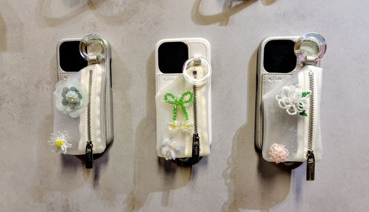 展示会で最も人気だったのが、ポケットに付けるビジューを選べるスマホケース。花をモチーフとしたビジューは3種類あり、ケースの色は白とグレーがある。1万2650~1万3750円。