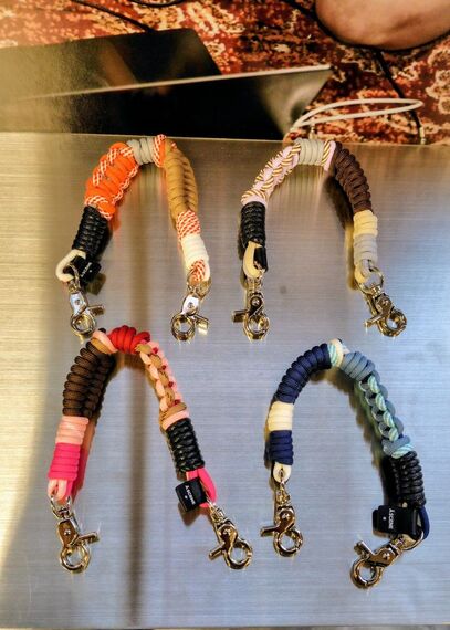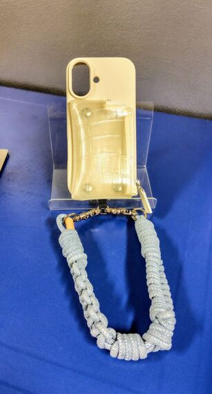 エーシーンは初めてシリコーンのスマホケースを出す。強度があり、汚れも取りやすいため企画した。白と黒があり、ポケット部分はクロコダイル柄。8800円。全長30センチのマルチカラーパラコードのストラップも新商品。エントリー商品と位置付け、5500円。デニムをひも状にして編み込んだストラップの新作は黒とライトブルーで7700円。