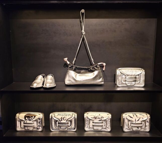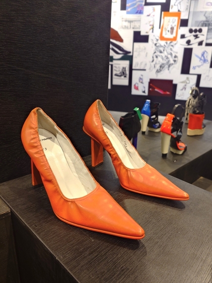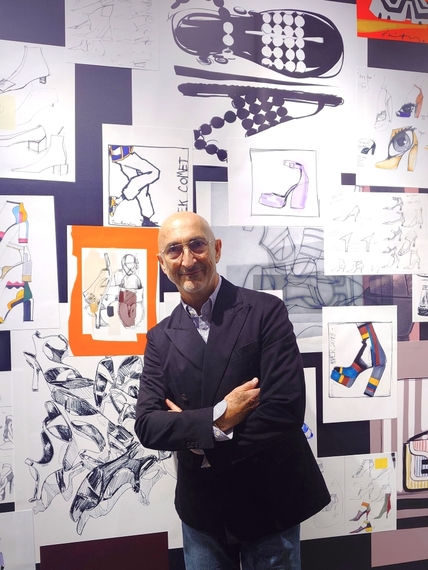 路面店の地下の空間には、ブランドを象徴するグラフィカルな配色のハイヒールやサンダル、ブーツが40足近く並ぶ。壁面には、創作の過程を物語るドローイングを展示。ファッション雑誌のイラストレーターとしてキャリアをスタートした芸術的なセンスも垣間見える機会となっている。
