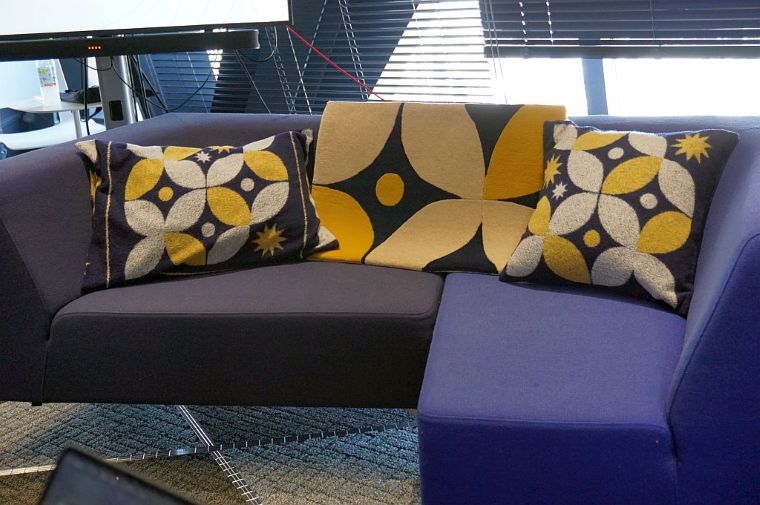 2チーム目は、米沢織のニトリトと米沢緞通の滝沢工房と組み、触れたり踏むと音が出るクッションやマットを企画。自然や星空を連想させる色柄で、音で宇宙とつながる感覚になる試作品を披露した。