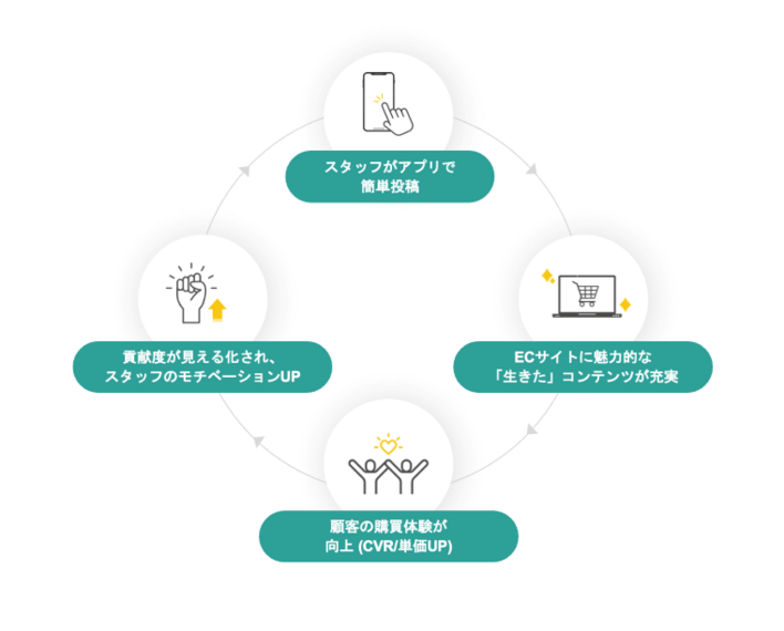 稲田社長はこれらのコンテンツの中でも「UGC、スタッフ投稿、レビュー、動画の4つは特に重要な資産で、LEEEPはこれらを商品ページに統合できる」。LEEEPではUGCをSNSから自社ECに誘引することができ、ハッシュタグで収集し、簡単にコンテンツ化できる。スタッフ投稿はお客の購買の後押しをするだけでなく、貢献の見える化でスタッフのモチベーションを高める効果もある。投稿数を増やすための簡単な操作性にもこだわる。お客様の声であるレビューはネット上だけでなくオフラインの店頭でもインセンティブを提供するなどで集める施策の実施も可能だ。動画はイメージ訴求やSNSだけに使うのではなく、商品購入を後押しするための情報として利用できるようにするのが重要だという。