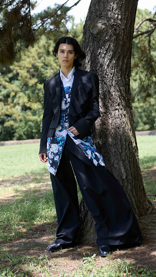 そのほか、ロックスターをイメージした袖に大胆なラッフルを取り入れたユニセックスの綿ブロードのシャツ(3万9900円)や、胸部分に左右で長さの違う切り替えをしてフリルの大きさも変えた半袖シャツを出す。ボトムはキュプラを使いドレープ性の高いスカートのようにプリーツを入れた極太シルエットのパンツ(4万4800円)や、ジーンズを解体しベルトループ、ポケット、バックヨークを思い切り下げたローライズのワイドフレアデニムパンツもある。尾州産ウールを近江晒で最終仕上げしたしわ感のある生地を使い、左裾だけを幅広にしたアシンメトリーなラップパンツをはじめ、ラッフルやパフスリーブを取り入れた左右非対称のスペンサージャケットやきもの風ジャケットを揃える。