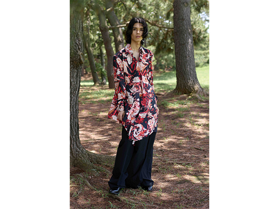 今回のリブランディングでは、25年秋冬物で提案したオリジナルの花柄プリントを進化させ、レディスライクなアイテムに落とし込んだ。中肉で落ち感のある遠州産のレーヨン100%ツイルを京都の老舗染色工場で反応染料を使ってプリントした生地は深みのある色合いが特徴。その生地を使いアシンメトリーなロングジレ(税込み5万4900円)、肩パッド入りのパワーショルダーに女性的なシェイプされたウエストとフレアラインをミックスしたロングシャツ(4万9800円)、サイドに切り替えを入れて体に沿うシルエットのショート丈シャツ(3万9800円)、ツータックのワイドパンツ(4万500円)を作った。