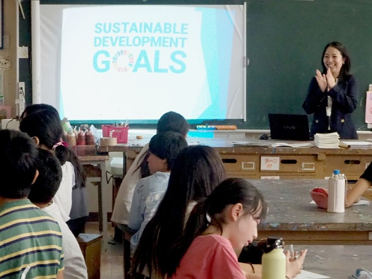 授業は6年生約50人を対象に、人事部の社員が講師を務めた。服ができるまでの工程やサステイナビリティーの取り組みについて説明したほか、製造過程で余った残布を使ってコースターを作るワークショップを行った。児童らは品質表示タグを確認しながら素材を学び、アップサイクルも体験、日常生活と環境問題のつながりを実感した。