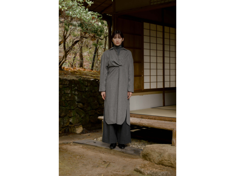きものの着くずれが着想源のシャツワンピースは、若干の襟抜き仕様で抜け感を出した。フロントにドレープを利かせて、シンプルな中にひとひねり加えた。ライトブルーと白は綿のシアー生地、グレーはウールを使っている。価格は生地によって異なり、綿は税抜き4万2000円、ウール5万5000円。