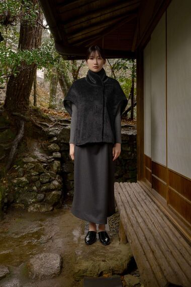毎年秋冬に出しているポンチョコートは、首周りにゆとりを持たせて、サイドベンツを取り入れるなど着心地の改善に取り組んだ。ベージュとチャコールの2色で、12万6000円。秋口の羽織り物として使えて、冬はコートの中に着ることもできるスーリーアルパカ混のハーフスリーブのポンチョ(4万2000円)も新たに提案する。