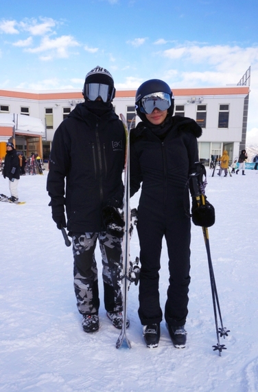 スノーボーダーは国籍問わずルーズシルエットが主流。香港から来たカップルはどちらも「オディブスキー」で統一。