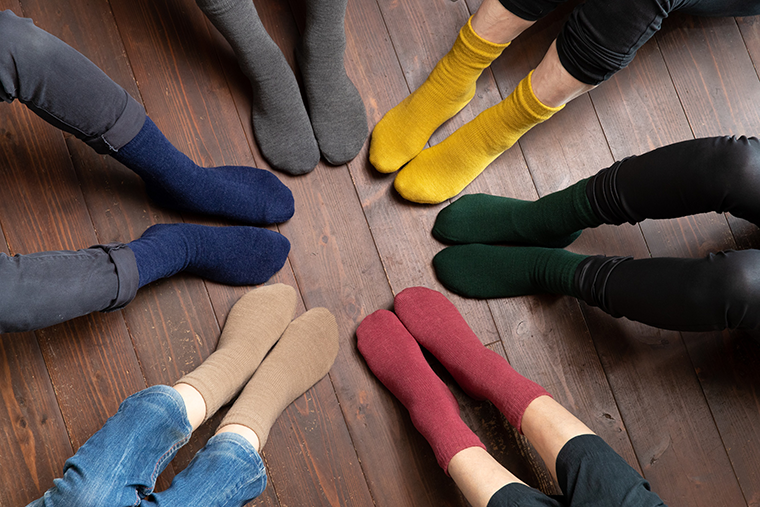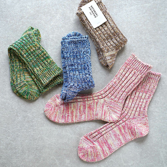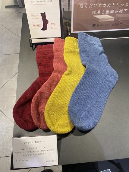 イチ押しは、5色の糸を使ったローゲージミックスソックス(税込み1650円)。好きな色の糸とサイズを選んでオリジナルソックスにできるオーダー受注会なども開催している。