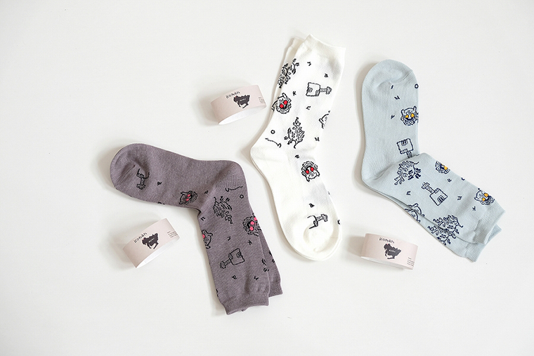 地元・江南市の街をテーマにした靴下「コウナン」など遊び心ある商品も揃う。江南市の観光地や花をテーマにした柄をあしらい、土産にもぴったりだ。1650円。