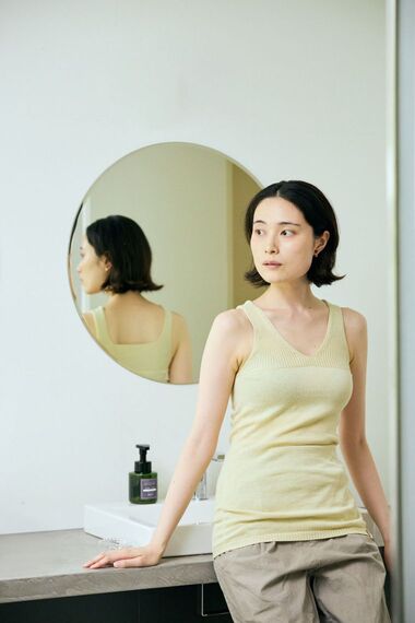 前後で着られるツーウェータンクトップやハイウエストレギンスなど5型ある。肌当たりの良いオーガニックコットンを使い、縫い代が肌に当たらずきれいなシルエットを出せる無縫製ニットを採用した。敏感肌の人や、自分をいたわり優しい物を身に着けたい人などに向けて届ける。