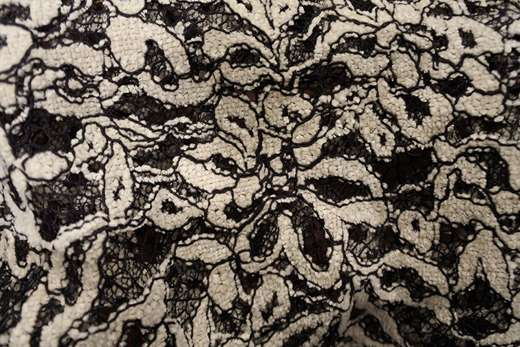 装いたいという気持ちを後押しするエレガントなスタイルが中心の「ニューオピュレンス」は、ラメを組み合わせたフラワー刺繍やラッセルレース、ベロアといった華やかなテキスタイルが中心だ。糸を起毛させフロック加工を施したようなウォーム感を付与したシアーニットは透け感と光沢感といった表情に加え、ストレッチ性も併せ持つ。