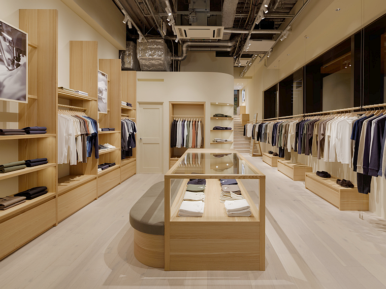 売り場面積は約100平方メートル弱。本国と同様にクリーム色の壁と木製什器で温かな雰囲気を出し、メンズのフルコレクションとウィメンズの一部を揃えた。壁面には、37年から続く英ロングイートンの自社工場の昔の作業風景や当時のロゴなどを飾っている。クラシックTシャツやボクサーショーツなどのアンダーウェア、柔らかな色みのスウェットなどが並び、見た目にも体感的にも心地良い空間だ。