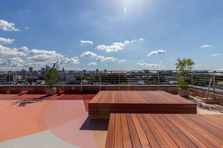 2~4階に備えたラウンジは、月額税込み2万2000円からのコワーキングプランを契約すれば、入居者でなくても使える。しゃれたタイルやアートで飾られた空間で、ウェブ会議用の小部屋や会議室も完備。都心を一望する開放的な屋上も利用できる。