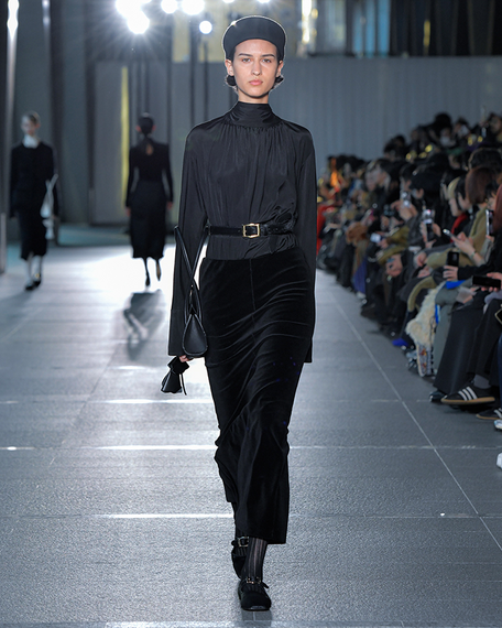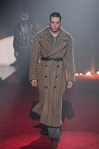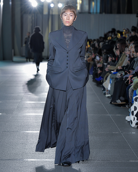 見応えがあったのは、マスキュリン&フェミニンのコントラスト。襟のラインが際立つピーコートにベルベットのタイトスカート。高い位置から入ったバックスリットがフェティコらしい魅力を作る。テーラードジャケットはラペルを極端に広く取り、胸元に広がるカーブラインをアクセントに生かす。その下には、プリーツで構成したワイドシルエットのトラウザー。クラシックな美しさを残しながら、大胆さを持ったエレガンスを描いた。