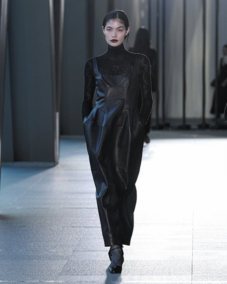 首元をすっきりと見せたブラウスにローウエストのベルベットスカート。ベルトをアクセントにウエストラインを強調する。鈍く光るレザーのドレスは、ビュスティエをベースにデコルテラインをかたどる。腰周りを柔らかな立体の線で構築し、凛(りん)とした一面としなやかさが交わる。