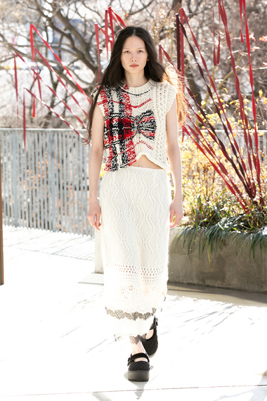 ゆがんだチェックとブラを重ね合わせるように編んだローゲージの半袖トップ。ケーブルニットに透かし編み、レースが連なるストレートスカート。ニットの柔らかなテクスチャーがフェミニンな印象に深みを出す。目を引くのは、リブ状に編み立てたタータンチェックのアイテム。ホールターネックのドレスは、チェックの編み地がウエストでふんわり広がって緩やかなフレアラインを成す。チェックを切り替えたMA-1に、キルト風スカートとパンツのレイヤード。ポリエステル糸を編んで構成したプリーツが軽やかに揺れ、キュートな魅力が映える。