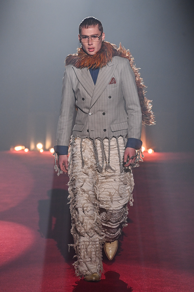 「シュガーヒル」(林陸也)は前回に続き、東京・新宿の淀橋教会を会場にした。赤いじゅうたんのランウェー、ショーの前にはジャズシンガーによるピアノの弾き語りが行われ、品のあるムードが漂う。加工に手間をかけたアメリカンカジュアルを強みとするなかで、テーラーリングのアイテムを交じえ、力強さのあるエレガンスを引き出した。ほつれたデニムをミルフィーユ状につないだパンツにピンストライプのテーラードジャケット。裾を割いて編み込んだフリンジが揺れ、躍動感を生み出す。