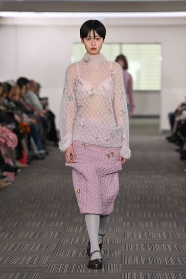 素肌が透けるレース編みのモヘヤセーターに、ルーズに変形したケーブルニットのスカート。透ける体の線と、ボリュームのある無造作なシルエットのコントラストがフェミニン。表面にはゴールドカラーのビジューがキラキラと輝く。