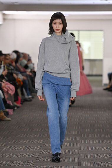 スウェットのフーディーはフードが横にずれて肩に乗っている。下に合わせるデニムパンツは、ディテールがそぎ落とされてフロントがたわむ。ごく普通のアイテムなのに、ピリングスと分かる造形の一貫性が光る。