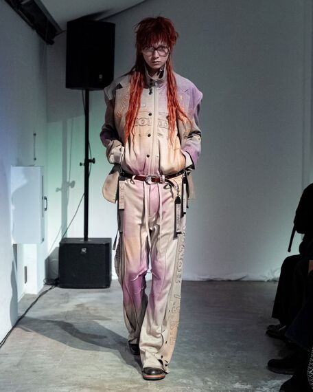 スウェットのトラックスーツにウールのテーラードジャケット。何げない日常着だが、パープルやオレンジの色彩がまだらに広がり、判然としない印象だ。胸元やパンツのサイドには、協業する「ホンダ」のロゴや数字のアップリケ、ジャケットには刺繍の英文字が連なる。長野らしい細かい加工によってアニメーションのように見せていく。セーターやバラクラバから垂れ下がるマフラーは、シャギーニットのジャカード柄がノイズのように映る。強みのレザーアイテムもグレイッシュカラーであいまいな印象を出す。身頃がメルトンのブルゾンと一対になったレザーベストは、まだら模様が入ったヘアカーフとのリバーシブルで、クラフトマンシップの美しさも感じさせる。