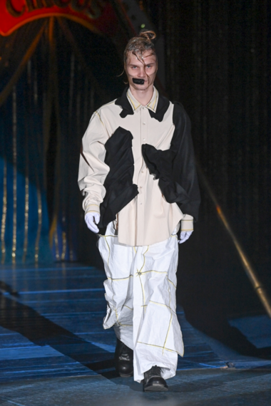 くたっと体になじんだテーラードスーツに襟が崩れたシャツ。きちんと仕立てられたフロックコートは、着古したように裾が柔らかなシルエットを描く。ありふれた日常着の景色は、トワルを組む過程を体現したスタイルへと変わる。ヌードボディーを模したTシャツにジャケットの身頃半分をレイヤード。トラウザーには平面のパターンを重ねて立体感やシルエットを強調する。トワルに見立てたシャツには黒い布でドレープを寄せて影を作り、服作りの過程にある不完全な美しさを感じさせた。