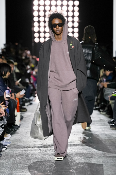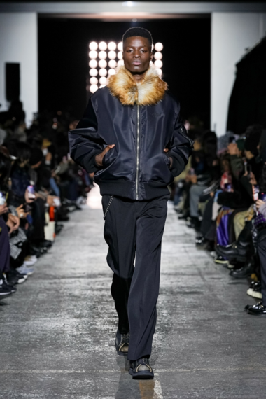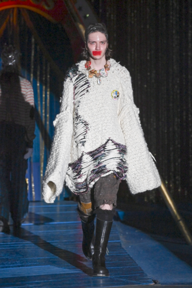 後半は川西らしいクラフトマンシップの詰まったワードローブ。ファーをパッチワークしたハーレークイン柄のロング丈プルオーバーに太い糸がむき出しになったローゲージのベスト。ワークブルゾンやパンツは、パステルカラーをのぞかせてダーティーに加工し、グランジな雰囲気を現代的な色彩で新鮮に見せる。無骨さのある服作りを強みとする中で、柔らかさを帯びたボリューム、いびつさのあるシルエットがコレクションに深みを出した。