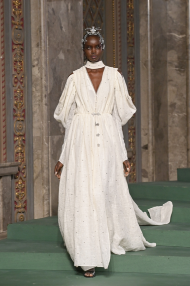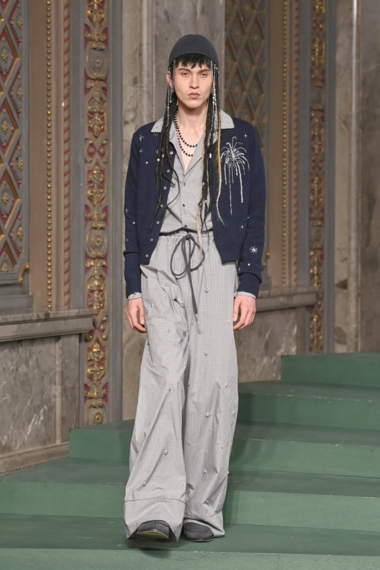 男性のモデルが着用するのはレースアップで素肌をのぞかせたポロシャツに、シルバーのパーツを差したトラウザー。メッシュのキャップにビジューのチェーンを垂らす。一筋の光を添えるアクセントに、フェミニンな繊細さを感じる。カーディガンの胸元には花火をビーズ刺繍で描く。セットアップのパジャマには星くずのようなビジュー。刺繍作家としての強みを生かしつつ、着る人のパーソナリティーに寄り添うように、テキスタイルに同化させる装飾が目を引いた。手織りのような素朴な生地で緩やかにドレープを寄せたドレスは、パールビーズの細かなドットが施されて気品が漂う。これまでもブラのようなボディーアクセサリーを作ってきたが、服とビジューが対を成す表現の幅が広がった。