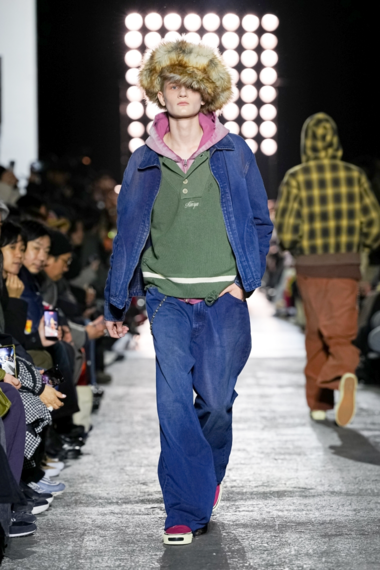 ビンテージ風の加工を強みとするなかで、フェード感のある配色にコントラストを利かせ、神谷らしい抜け感を出す。オリジナルのバンダナ柄を用いたピンクのワークブルゾンやイエローのベストは、程よく色あせてリラックスムード。ピンクのフーディーは内側の鮮やかな色味がアクセントになって、何げないウォッシュドデニムのセットアップを都会的に感じさせる。ボリューミーなファーのキャスケットを合わせて、パンチを効かせた。