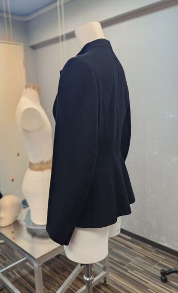 既存のボディーは、はと胸型がほとんどで、仕上がりをイメージしにくかった。パワーショルダーのジャケットを作るのも難しい。「男性用のボディーを使ってトワルを組むと、女性のきゃしゃな体に合わせた際にしわや型崩れが生じてしまう。ショルダーラインを真っすぐに保てるよう、大きく直す」苦労があった。