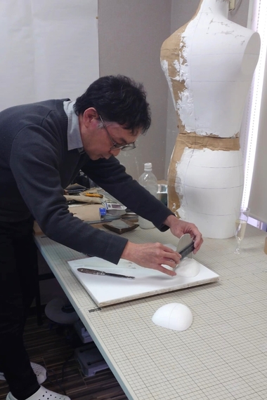 その時の原型師が、後に小泉さんと共に東京ドレスフォームを立ち上げた鶉雄次郎さん。北村さんが意識していなかった細かい部分までヒアリングし、フォルムを導き出す。その後、過去に作られた複数の原型を輪切りにして組み合わせ、手作業で調整しながらオリジナルの原型を制作する。