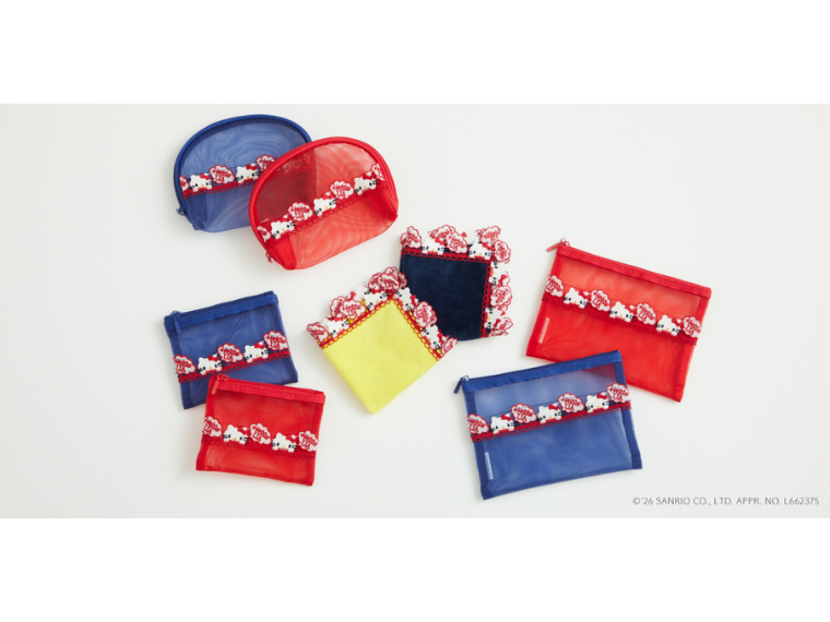 70年代のハローキティをイメージした刺繍をあしらったハンカチ(税込み3850円)、メッシュのポーチ(2750~4180円)を販売する。ハンカチはネイビーとイエローの2色、ポーチは鮮やかな赤と青の2色だ。第1弾で発売したリボンバッグ(1万4900円)とチャーム(3300円)も再販する。
