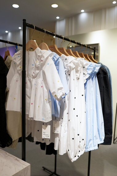 アンミヌベビーは25年春夏に始めたばかり。レディス服のデザインをもとに、親子でリンクコーディネートができる子供服を打ち出している。今秋冬は、小さなハートの刺繍をちりばめたワンピース(税込み1万1000円)や、ハンドメイドのスタイ(4000~5000円台)、ヘアターバン、ヘアピンを販売している。