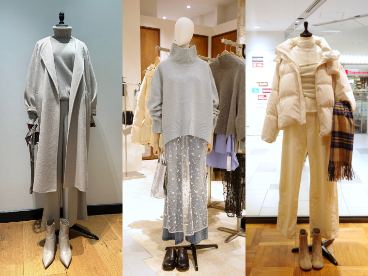「自分へのご褒美」をテーマに、ホリデーらしい華やかなスタイリングを提案する。オフショルダーのセーターや艶のあるフェイクファーブルゾン、ベロアのワイドパンツなどを取り入れ、イベントや食事会にも映える着こなしに仕上げる。ジュエリーの新作は各店舗を巡回する期間限定店として見せ、丁寧な接客で訴求する。