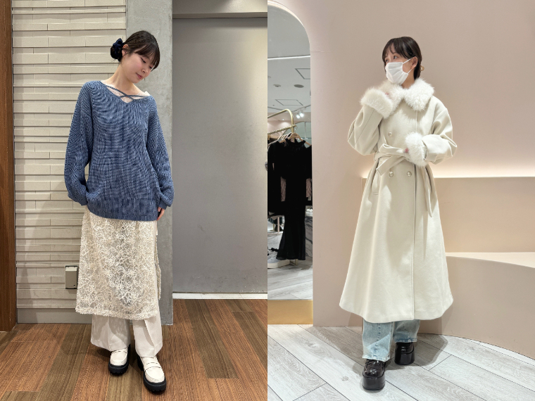 ホリデー気分を盛り上げるため、ビジューやフェイクファーを付けた華やかなアウターを推す。今年はセーターよりアウターの売れ行きが良い店が多い。ウール調素材のきれいめなミドル丈コートやフェイクファーブルゾン、モンスターコート風の中わたジャケットが売れ筋だ。色はグレーやブラウン、モノトーンなど、落ち着いた色が選ばれやすい。ガーリー一辺倒の流れは落ち着き〝大人っぽくきれいめ〟なスタイリングが今の気分だ。