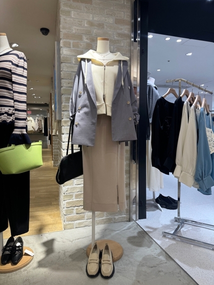 プレッピーをテーマに、ビッグシルエットのシャツやスウェットトップ、キャップ、紺ブレを打ち出す。シャツにはレースのインナーを重ね、ボトムにサテン風スカートを合わせるなど、女性らしさを加えた着こなしを提案する。スウェットトップはオフショルダータイプが人気だ。色はペールトーンのイエローとピンクが動いている。