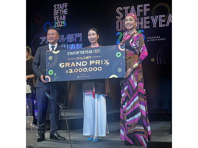 バニッシュ・スタンダードは10月9日、店舗スタッフDX(デジタルトランスフォーメーション)アプリ「スタッフスタート」を活用する販売員の大会「スタッフオブザイヤー2025」を開いた。競ったファイナリストは、アパレル部門12人と物販部門2人。国内外3000ブランドを中心に選出された1959人によるセカンドステージを勝ち抜いてきた。アパレル部門では、トゥモローランド丸の内店Nitoさんがグランプリに輝いた。
