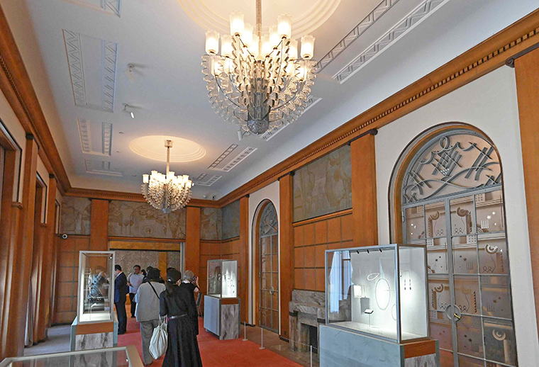 牟田氏は、旧朝香宮邸として1933年に建てられた同館の内装に、アンリ・ラパンやルネ・ラリックらアール・デコ博の装飾美術家たちが関わったこと、アール・デコ博を朝香宮夫妻が訪れていたという歴史的なつながりに触れた。方波見氏はそうした背景から「作品も空間も『アール・デコの本物』。それがコンセプト」と述べ、各部屋の装飾とジュエリーとの同時代性を数多く見つけられたとした。