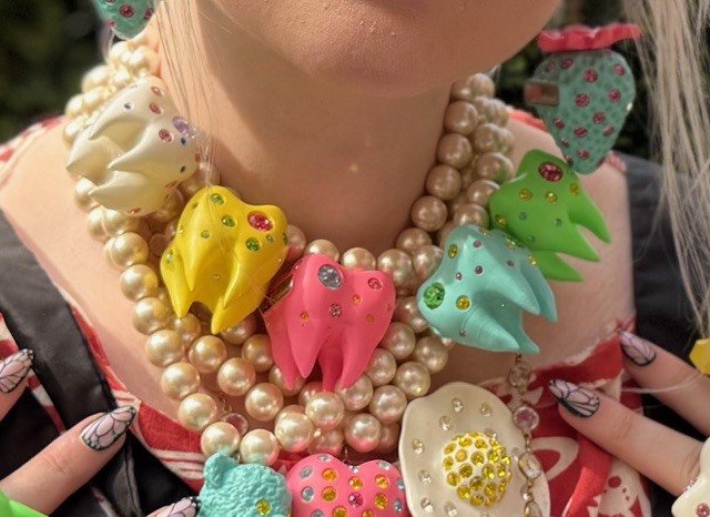 一番人気のあるモチーフは「歯」。ピンク、赤、白、黄色、水色、グリーンでネックレスと指輪をつくっている。