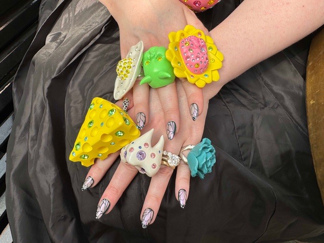ベイトマンさんは、パーソンズで総合デザインと文学論をダブルメジャーで専攻し、夏休みにセントラルセントマーチンズでニットウエアを学んだ。ジュエリーの勉強はしていなくて、独学で学んだという。