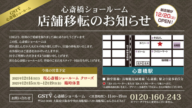 株式会社GSTV2025年12月20日(土)、心斎橋ショールームが新天地へ移転オープンいたしました!株式会社GSTV(本社:東京都品川区、代表取締役:今橋徹、以下「GSTV」)は、この度、心斎橋...
