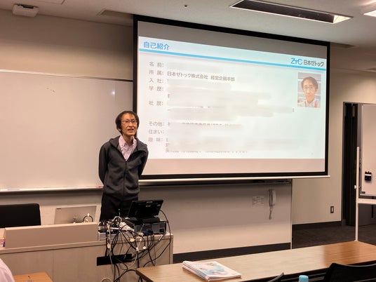 講義全体のテーマは「知的資産に関する理解を深め、企業の持続的成長のための経営デザインを考える」であり、全15回で構成されています。その中で3回に当社経営企画部の担当者が登壇し、当社の企業戦略、事業開発、知的財産の活用などについて講義を行うと共に、講義の課題である日本ゼトックで取り組みたい新規事業について議論やアドバイスを行いました。最終回となる11月12日の講義には、当社代表取締役会長の牧田裕樹と常務取締役の土井信幸が出席し、学生による日本ゼトックの新規事業に関するプレゼンテーションが行われ、その内容に対して双方向でディスカッションが行われました。