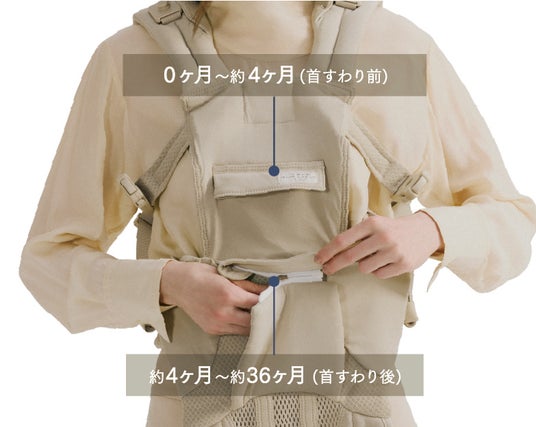ファスナーを付け替えるだけでお尻の位置(座面の高さ)を2段階に変更可能。赤ちゃんの成長に合わせて常に最適なポジションに調整できます。