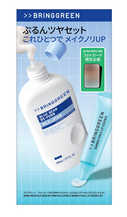 ブリングリーン独自の保湿成分「ブルービーン B5-PDRN(TM)*¹」を配合し、お肌の水分・油分バランスを整え、肌バリアをサポートしながらしなやかなお肌へ導く乳液と、寝る前の集中ケアにもデイリーリップケアにも使えるリップエッセンスのセットに、ALPHA DRIVE ONEのフォトカードが2枚封入された特別セット。ALPHA DRIVE ONEがブランドアンバサダーに就任後、初の日本向け企画セットです。