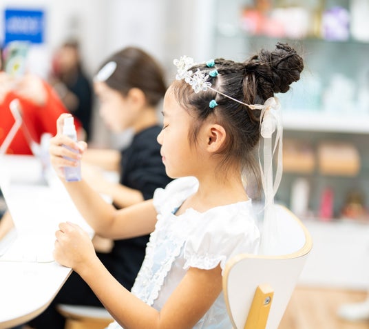 9月に発売された新商品〈アイフルールパレット〉は、アイシャドウベースとチップがセットになった万能パレット。肌馴染みの良いオレンジブラウン系の〈イエローベース〉と、血色感を引き出す青みピンク系の〈ブルーベース〉の2タイプを展開。それぞれ「仕込みベース+3色設計」で、簡単に自然なグラデーションが完成します。初めてアイシャドウに挑戦する子どもたちは、そっとブラシを動かしながら、自分の“似合う色”を見つけていました。