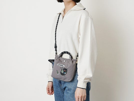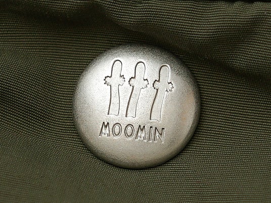 軽撥水加工を施したナイロン素材を使用しているので、急な小雨にも対応。トップにはニョロニョロが刻印されたボタンが付いているので、貴重品を入れても安心です。