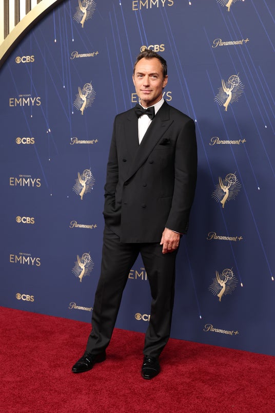 俳優のジュード・ロウは、ブラックのダブルブレスト ピークドラペル・イブニングジャケットに、ブラックのイブニングトラウザーズを合わせ、コットンのイブニングシャツ、シルクアクセサリー、パテントシューズを着用しました。