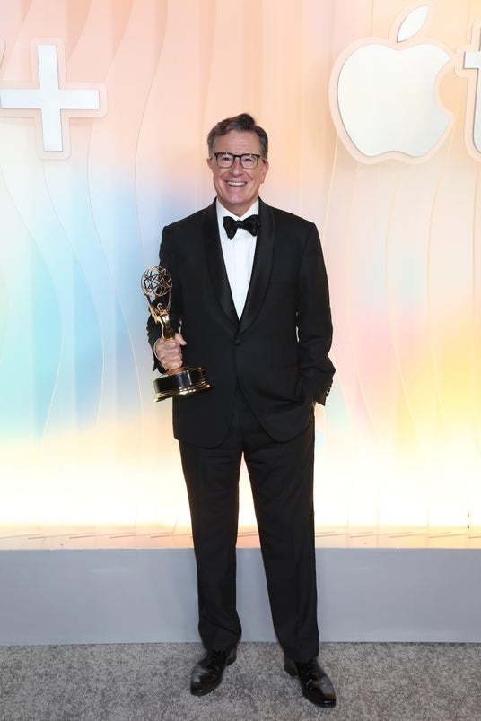 俳優のスティーブン・コルバートは、ブラックのショールカラー タキシードに、ホワイトのコットン イブニングシャツに、シルクアクセサリーを着用しました。