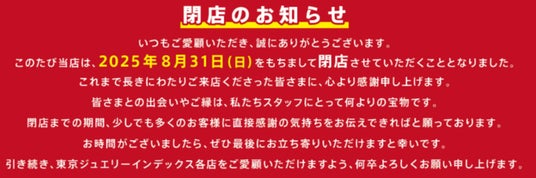 株式会社オリエント4C's(所在地: 東京都台東区、代表取締役社長: 三枝幹弥)が運営するジュエリーショップ「東京ジュエリーインデックス」の草加店(草加マルイ2階)は2025年8月31日をもちまして閉店いたします。