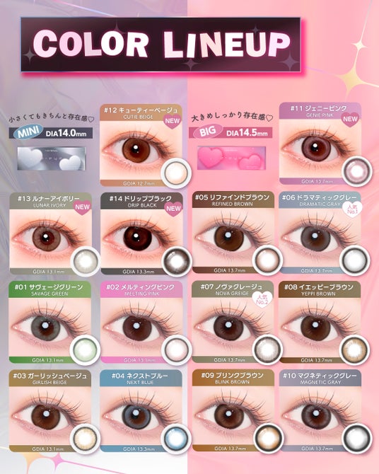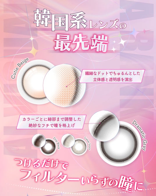 瞳への優しさと快適さを追求した“シリコーンハイドロゲル素材”と、韓国系レンズの最先端をいくレンズデザインで、“つけるだけでフィルターいらずの瞳”を実現します。